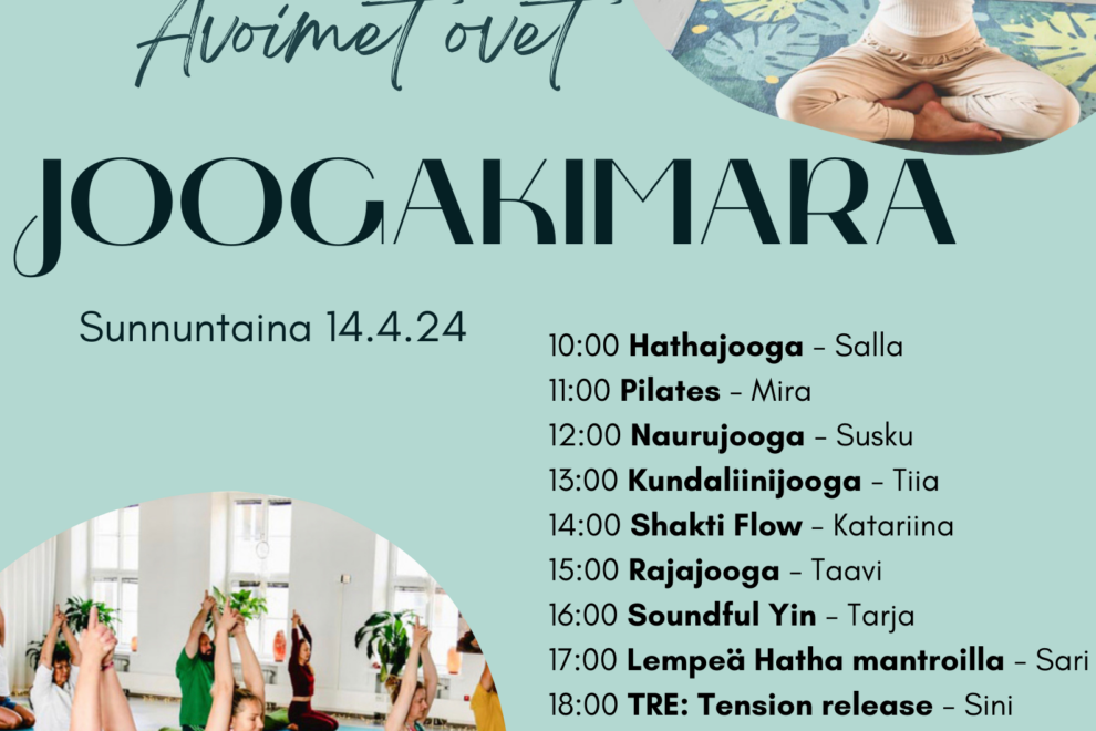 Sunnuntai 144.2024 klo 10-20:30 Tervetuloa kokeilemaan monipuolisia joogatuntejamme Shantiin avoimien ovien päivänä! Tarjolla lähes koko viikkotuntiemme upea kattaus. Mukaan pääset tulemalla paikalle, ei tarvitse ilmoittautua ennakkoon. Hinta 5€. Katso päivän aikataulu alta.